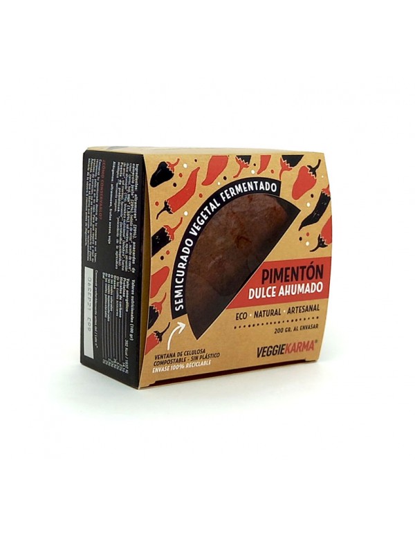 Queso vegetal Semicurado Pimenton Dulce Ahumado es un queso semicurado vegetal, artesanal, fermentado y ecológico. Sin gluten, raw y saludable. Fuente de proteínas de alta calidad,grasas saludables, omega 3, 6 y 9, probióticos derivados de la fermentación, triptofano vitamina B1 y minerales como cobre, magnesio, hierro, zinc, fósforo y selenio. Presenta entre sus ingredientes pimentón dulce ahumado. Este condimento es rico en vitaminas E –potente antioxidante-, A, B1, B2, B3, B6 y especialmente rico en vitamina C, teniendo más que los cítricos), minerales (fósforo y magnesio, potasio y calcio), ácido fólico, carotenos (antioxidantes), capsantina y beta carotenos.