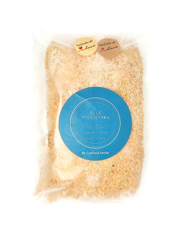 Proteína de trigo (gluten)*, harina de garbanzos*, shoyu*(soja), preparado vegetal estilo CaVrales (anacardos, penicilum roquefort, extracto de coco, agua), preparado vegetal estilo lacón (tofu* -soja-, proteína de trigo -gluten-*, harina de arroz*, aceite de girasol*, ajo y cebolla en polvo*, levadura nutricional*, aroma de humo, aromas), pan rallado de trigo*, lino, pimentón ahumado*, pimienta negra, pimentón dulce*, aromas, aroma de humo, sal marina. *Ingredientes procedentes de agricultura ecológica.