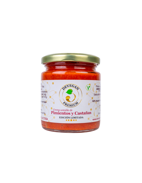 Auténtica combinación de los mejores pimientos asados del Bierzo y las castañas más dulces de la variedad parede. Prueba la combinación de tu queso vegano favorito con este paté y descubre el auténtico sabor de algunas de las tradiciones de El Bierzo. Premiado por la diputación de León como LA MEJOR CONSERVA DE LEÓN 2021.