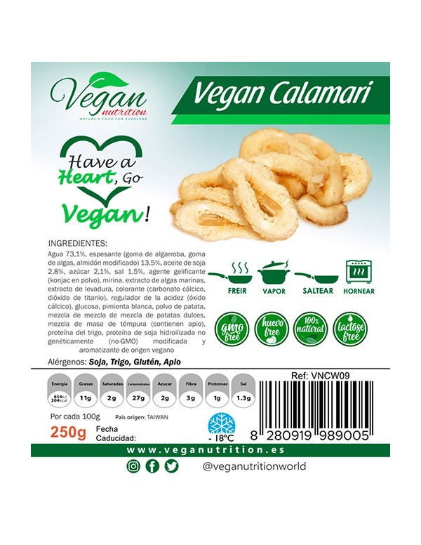 Agua 73,1%, espesante (goma de algarroba, goma de algas, almidón modificado) 13,5%, aceite de soja 2,8%, azúcar 2,1%, sal 1,5%, agente gelificante (konjac en polvo), mirina, extracto de algas marinas, extracto de levadura, colorante (carbonato cálcico, dióxido de titanio), regulador de la acidez (óxido cálcico), glucosa, pimienta blanca, batata en polvo, mezcla de masa de témpura (contiene apio), proteína del trigo, proteína de soja hidrolizada no transgénica y aromatizante de origen vegano.