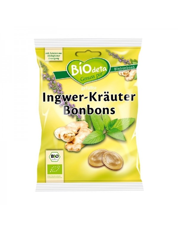 Caramelos de jengibre y hierbas ecológicos, no demasiado dulces, rellenos con extracto de jengibre y una mezcla de 13 hierbas aromáticas: regaliz, manzanilla, aquilea, caléndula, hinojo, llantén mayor, zarzamora, menta, tomillo, salvia, tila, flor de sauco y primuta vens.