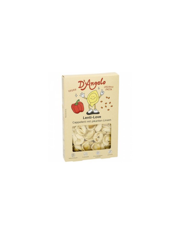 Cappelletti con lentejas rojas, tomate y pimiento.