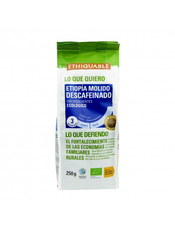 Café 100% arábica de altura tostado y molido. Descafeinado sin disolventes, este moca etíope se cultiva orgánicamente a una altitud de 1200 a 2200 metros. Tiene un cuerpo ligero, una gran dulzura y flores blancas típicas de la región de Sidamo.