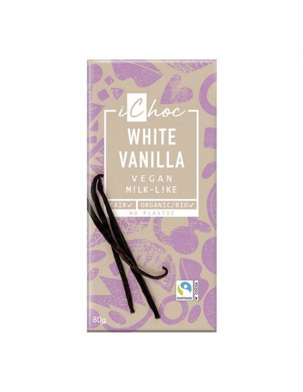 Ingredientes: Manteca de cacao* 37%, azúcar de caña integral*, bebida de arroz en polvo* (sirope de arroz*, deshidratado), sémola de chufa*, sal, extracto de vainilla bourbon*, vainas de vainilla bourbon* (molidas).*=de agricultura ecológica.