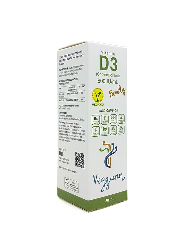 Vitamina D3 en forma de Colecalciferol (orígen vegetal) 800 IU por mililitro (mL) Vitamina E y aceite de oliva.